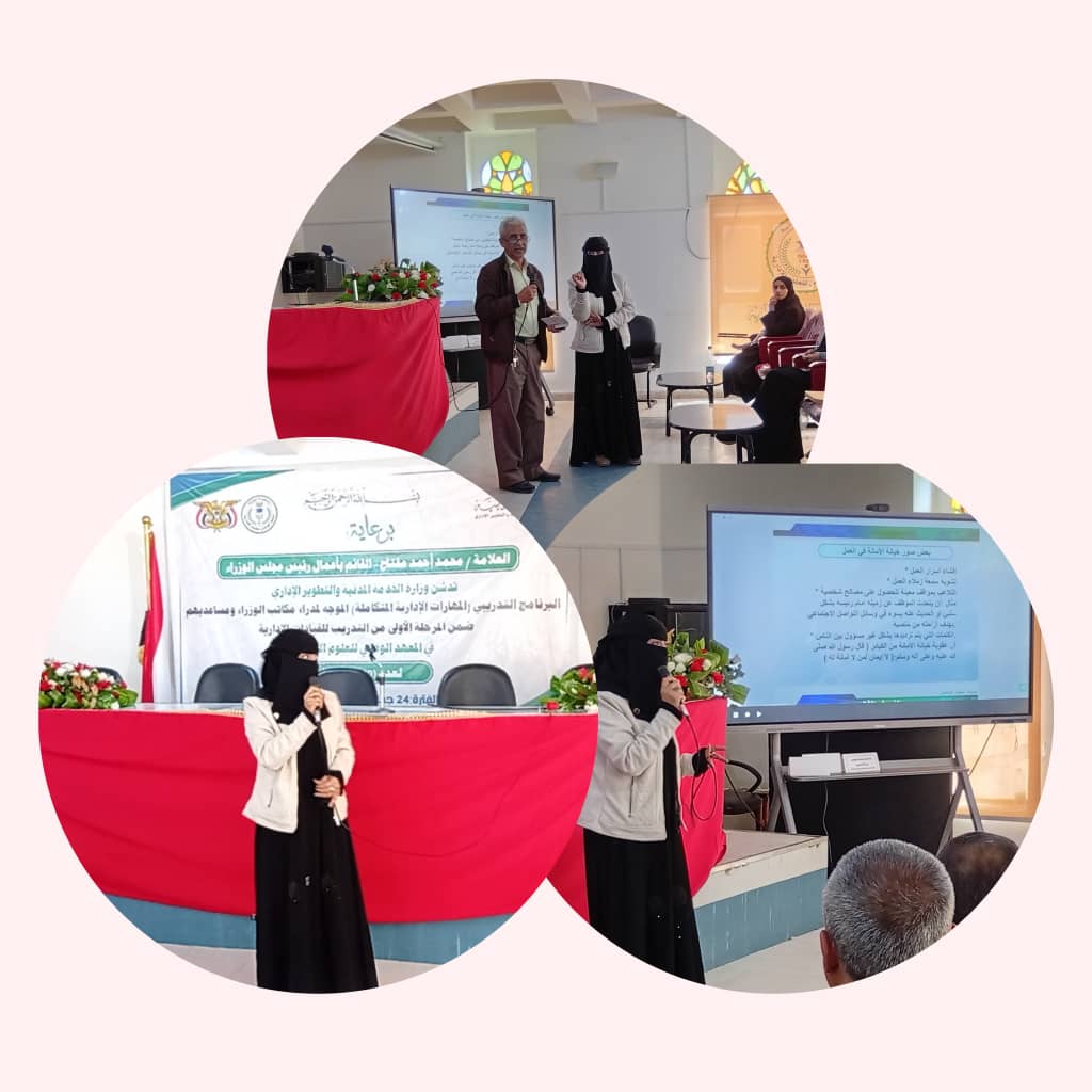 إجتماع لجميع موظفي المعهد حيث أعلن عن قرارات التدوير الوظيفي حيث كما ناقش عميد المعهد دور وأهمية المعهد خاصة ما تم تحقيقه من انجازات في الجانب التعليمي من وإستحداث البكالريوس والماجستير و أوضح العميد لكافة الحاضرين أهمية تكاتف الجميع في التسويق لهذه البرامج بما يعيد زخم الاقبال للتسجيل في المعهد وأشار كذلك الى السعي لإنشاء صندوق التدريب وبما يعزز قيام المعهد بدوره في تدريب موظفي الدولة كأحد روافد تعزيز التمويل للمعهد وشكر العميد جمع الحاضرين متمنياً ان يظطلع كل عضو في المعهد بدور إيجابي كما تحدثت الأستاذه نوال الحداد نائب العميد للتدريب حول خصوصية التدريب و نوعية المدربين حيث تعتمد هذه النوعية على جهد كبير يبذله المدرب في تطوير نفسه من حيث قدرة الاداء و المعرفة فليس كل حملة المؤهلات قادرين على ان يكونوا مدربين وهو ما يعكس الأهمية الكبيرة لوظيفة التدريب كونها تشمل كل مستويات الإدارة كما تحدث رئيس مركز الجودة الدكتور صادق عجان الى ان الجودة تدخل في كل مفاصل الأداء الإداري والأداء التعليمي وكذلك الأداء التدريبي وقد أصبحت الجودة هي الفيصل في تحديد ورفعة المؤسسة العلمية وأختتم العميد الإجتماع متمنياً تمام التطور للمعهد ومنتسبيه
